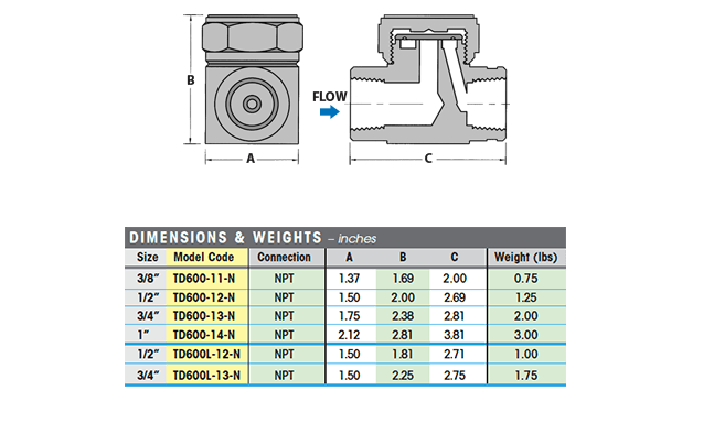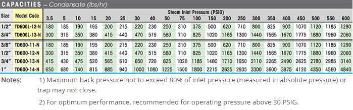 The TD600L has reduced size discharge orifice holes which are preferable in terms of performance, longevity, and efficiency; particularly on pressures over 150 psi. For most drip applications the 1/2” TD600Lshould have sufficient capacity. For higher load drip applications or if a 3/4” pipe connection is required, use 3/4” TD600Lfor best results. Choosing a model with a condensate handling capacity in the range of the specific application will prolong trap life.