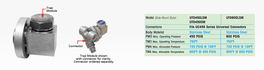 DRIP, TRACING: Designed for drip applications for the draining of condensate from steam mains and other steam supply lines as well as for tracing applications. The UTD450 & UTD600 Steam Trap Modules can be used anywhere conventional thermodynamic steam traps are used. This trap module can be used on either vertical or horizontal piping installations and can mount to any 2-bolt Quick-Change Universal Connector.