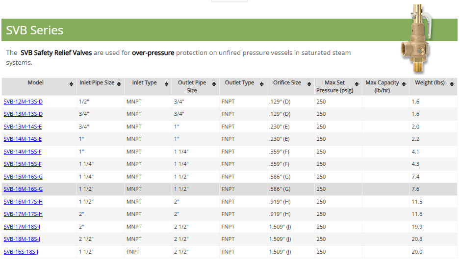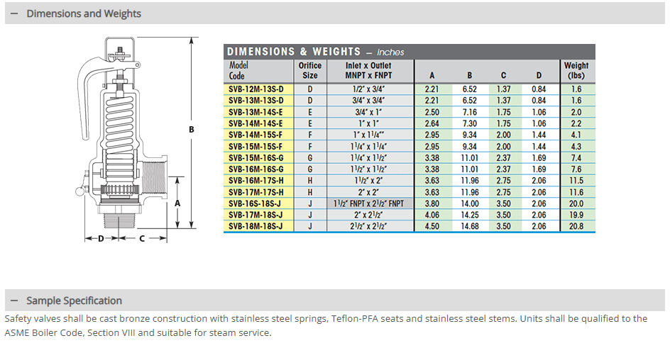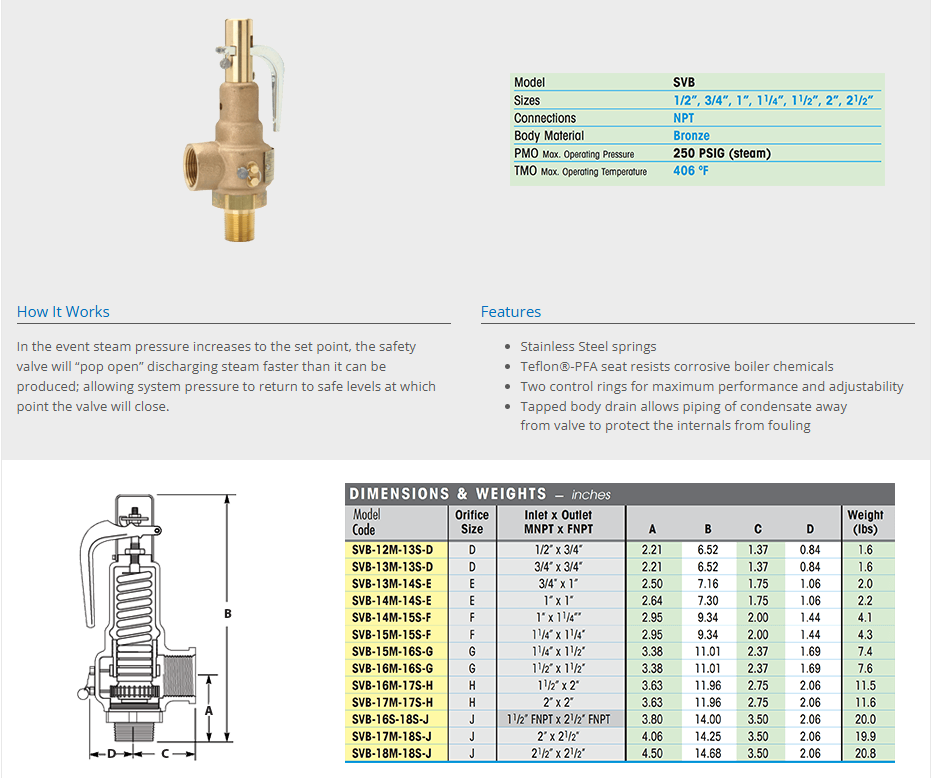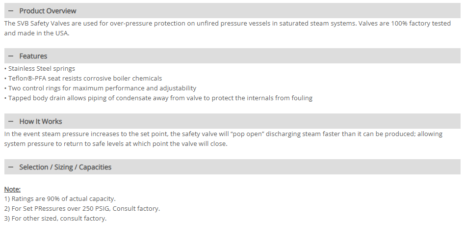 The SVB Safety Valves are used for over-pressure protection on unfired pressure vessels in saturated steam systems. Valves are 100% factory tested and made in the USA.