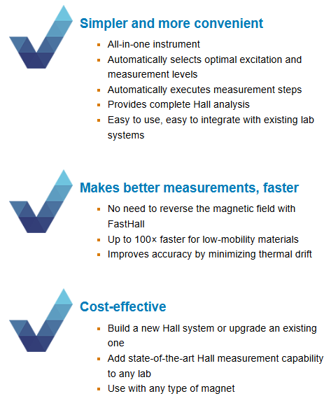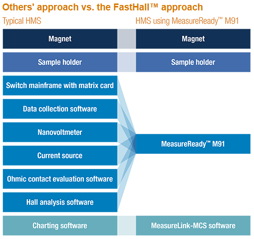 Traditional Hall effect measurement systems (HMS) provide basic electrical measurement instrumentation combined with a switching unit to measure sample resistivity and Hall voltages but must rely on separate PC-based software to perform pre- and post-measurement calculations in order to ultimately derive the physical parameters that researchers need to know—resistivity, carrier type, carrier concentration, mobility, and Hall coefficient.